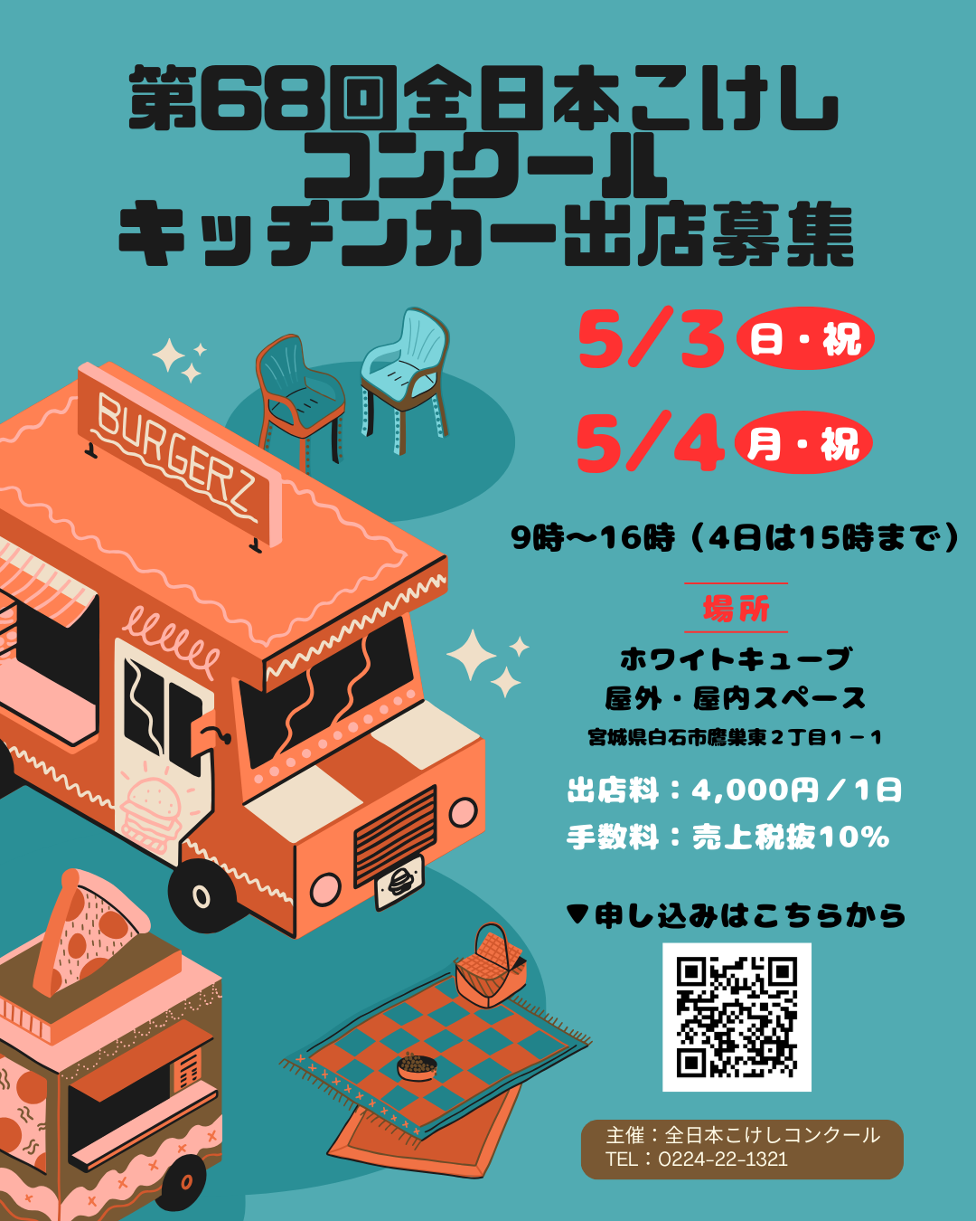 未分類第68回全日本こけしコンクールでは、キッチンカーでの軽食等の提供により来場者の満足度向上につなげることを目的に、会場のホワイトキューブ(屋外・屋内スペース)に出店できるキッチンカーを募集しています。
